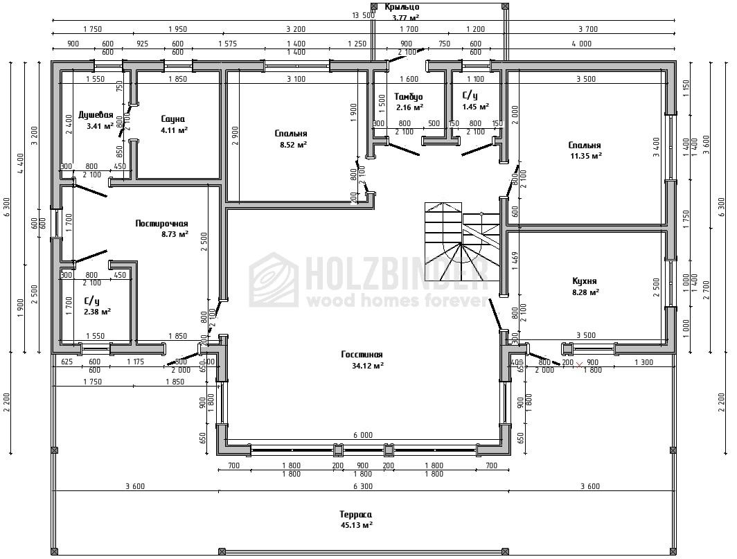Лестница на второй этаж (если присутствует в проекте) исполняется техническая. Входная группа комплектуется ступенями. Дверные и оконные проемы выполняются с ройками. Двери и окна не входят в данную стоимость и заказываются отдельно по желанию заказчика. Наружная и внутренняя отделка не выполняется.