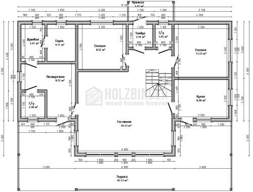 Нижний венец исполняется из бруса 150х150 мм, устанавливается по периметру, и одна перемычка посередине (при необходимости, в зависимости от размера и конфигурации дома, могут устанавливаться дополнительные перемычки). -