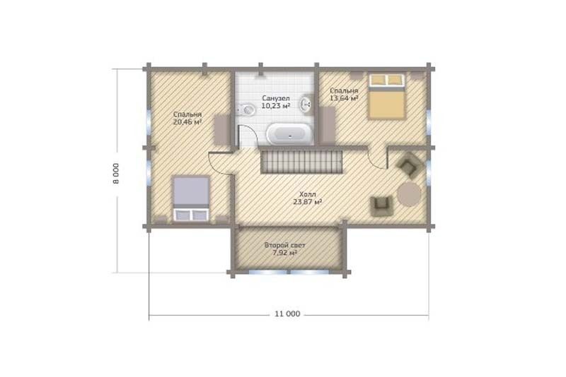 Стропила выполняются из бруска 40х150 мм и устанавливаются с шагом не более 60 см. Для перекрытия над вторым этажом используются лаги 40х150 мм и устанавливаются с шагом не более 60 см. Высота конька стропильной системы от пола второго этажа не ниже 3,6 м.