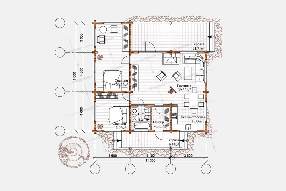 Нижний венец исполняется из бруса 150х150 мм, устанавливается по периметру, и одна перемычка посередине (при необходимости, в зависимости от размера и конфигурации дома, могут устанавливаться дополнительные перемычки). -