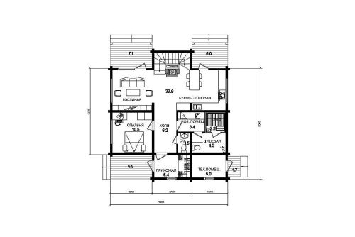 Нижний венец исполняется из бруса 150х150 мм, устанавливается по периметру, и одна перемычка посередине (при необходимости, в зависимости от размера и конфигурации дома, могут устанавливаться дополнительные перемычки). -