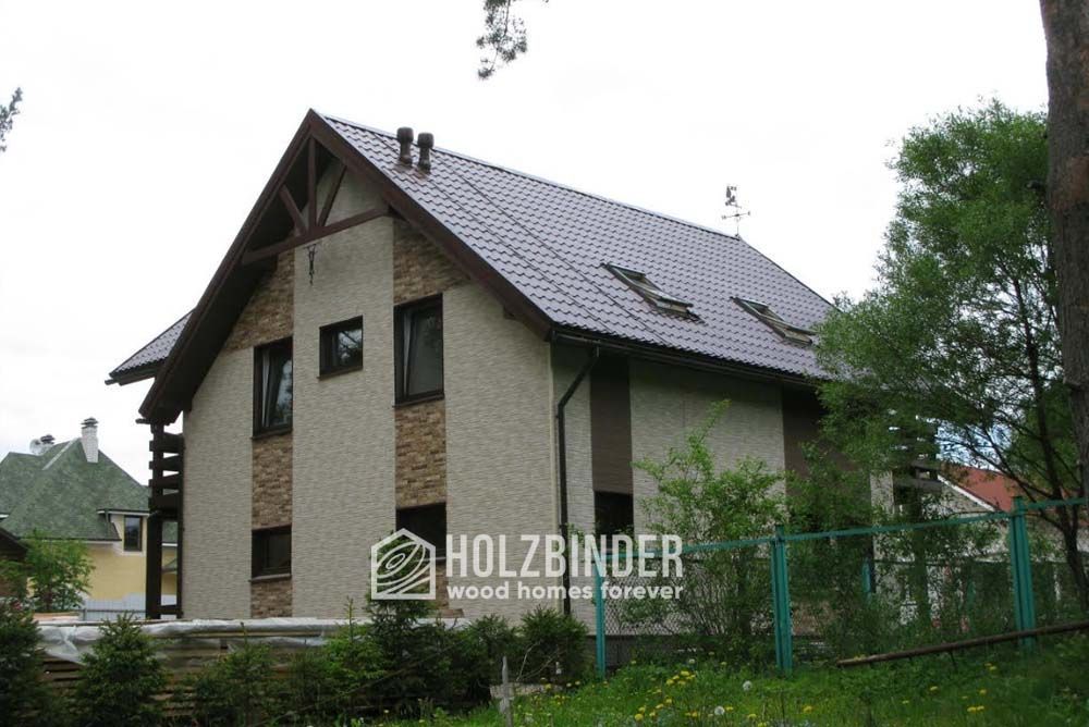 - опорные столбы на террасах – вертикальный составной брус 150*150 мм (3 скрепленных доски 50*150 мм), отделанный вертикальной имитацией бруса 16*140 мм и деревянным уголком 50*50 мм