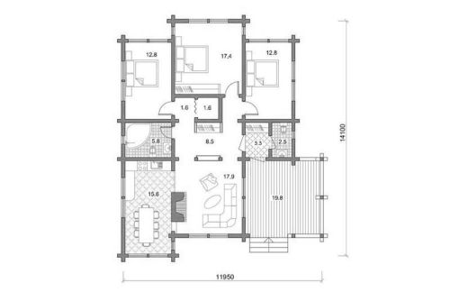 Нижний венец исполняется из бруса 150х150 мм, устанавливается по периметру, и одна перемычка посередине (при необходимости, в зависимости от размера и конфигурации дома, могут устанавливаться дополнительные перемычки). -