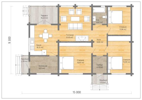 Нижний венец исполняется из бруса 150х150 мм, устанавливается по периметру, и одна перемычка посередине (при необходимости, в зависимости от размера и конфигурации дома, могут устанавливаться дополнительные перемычки). -