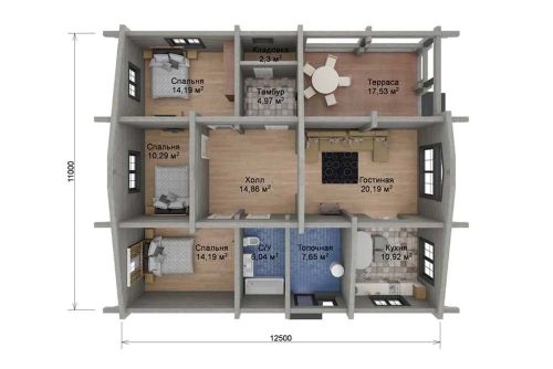 Поэтажные планы, фасады, разрезы, 3D виды. План фундамента. План развертки скатов кровли. План раскладки балок цокольного перекрытия. План раскладки балок межэтажного перекрытия. План стропил. Развертки стен.
