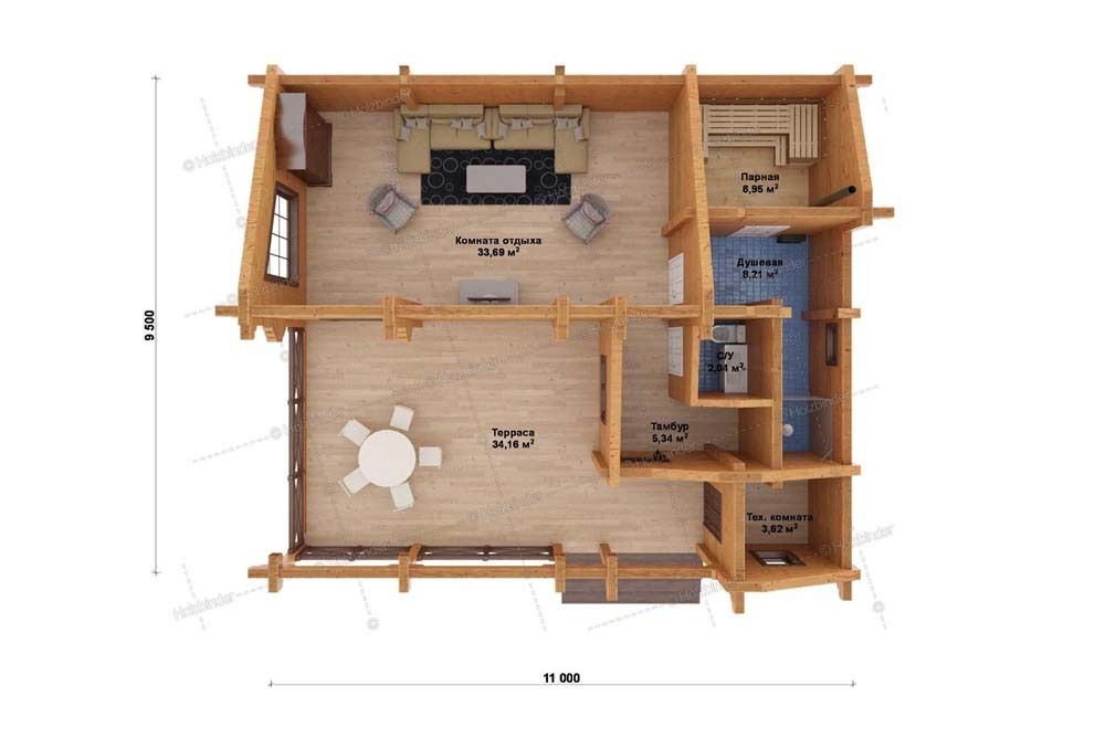 Нижний венец исполняется из бруса 150х150 мм, устанавливается по периметру, и одна перемычка посередине (при необходимости, в зависимости от размера и конфигурации дома, могут устанавливаться дополнительные перемычки). -