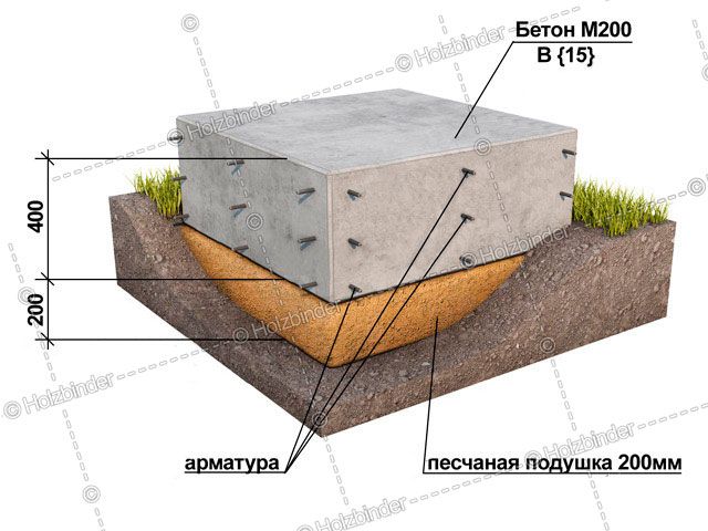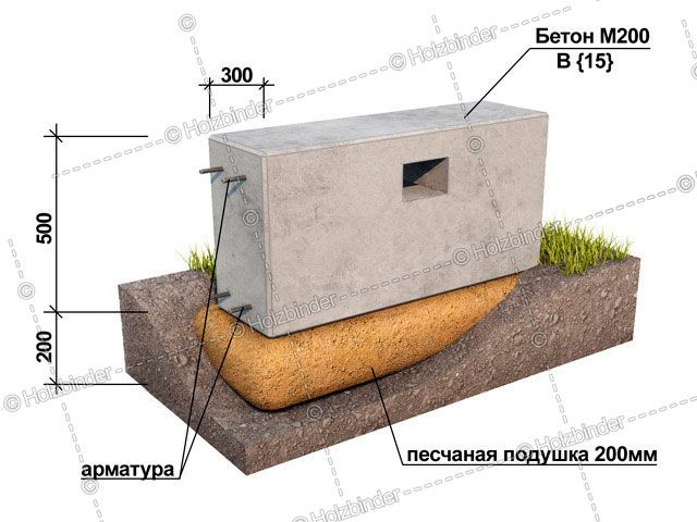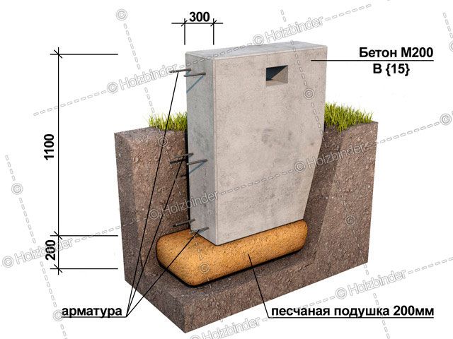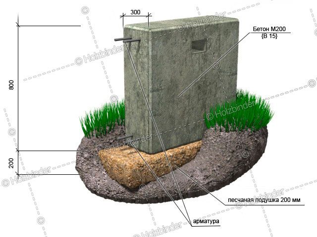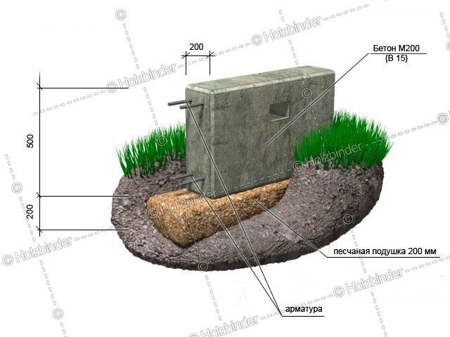 - Песчаная подушка – глубина 20 см., на поверхности – высота цоколя 50 см., глубина в землю 60 см., ширина 40 см.