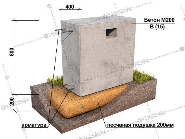 - Песчаная подушка – глубина 20 см., на поверхности – высота цоколя 80 см., ширина 40 см.