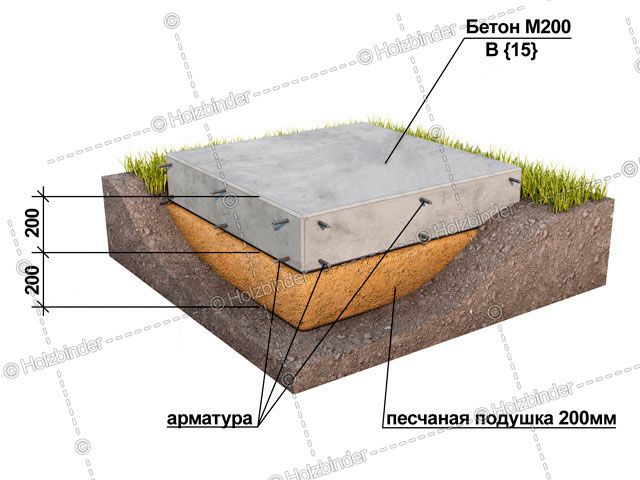 - Плита: Песчаная подушка – глубина 20 см., на поверхности – высота бетона 20 см.