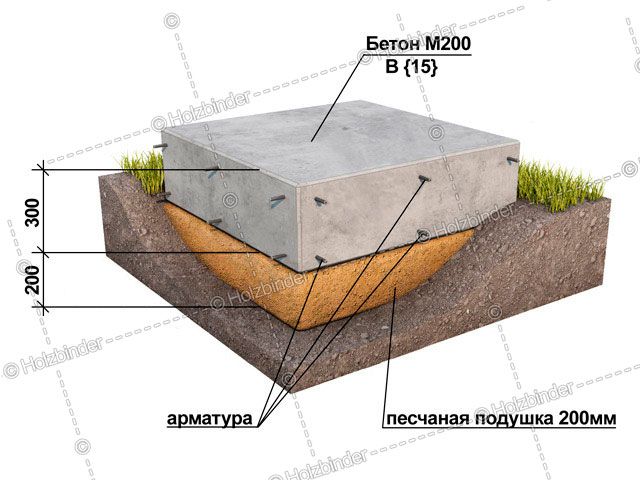 - Плита: Песчаная подушка – глубина 20 см., на поверхности – высота бетона 30 см.