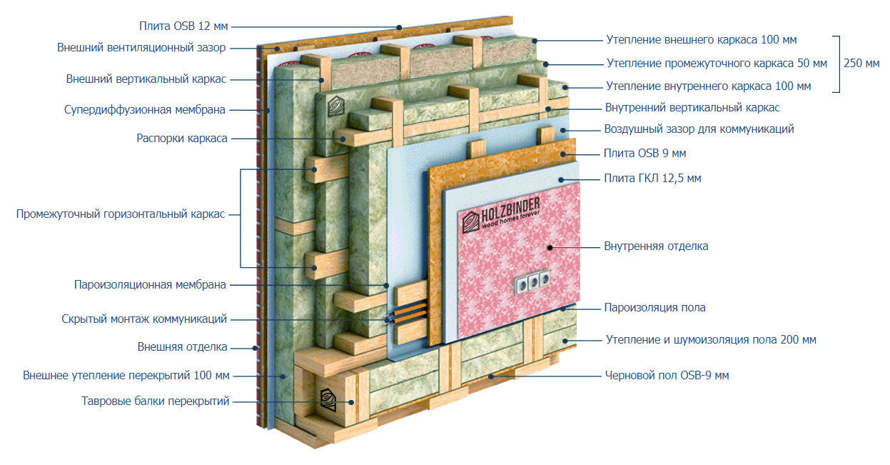 - Стена состоит из трех жестко связанных деревянных каркасов: внешнего, промежуточного и внутреннего.